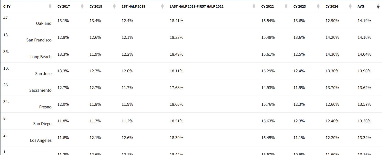 Forget the sanitized “official” government stats—let’s lean on the Chapwood Index, a no-BS measure of real after-tax spending on the 150 everyday items that hit families hardest. Unlike official numbers that seem plucked from thin air or the most important categories magically left out of the algorithm, Chapwood tracks actual price tags in America’s 50 biggest cities, twice a year, without the seasonal smoke and mirrors. Their latest drop for calendar year 2024 (released earlier this year) paints a brutal picture: Overall cost-of-living jumps averaging 11-14% across major metros, with no signs of cooling into 2025.