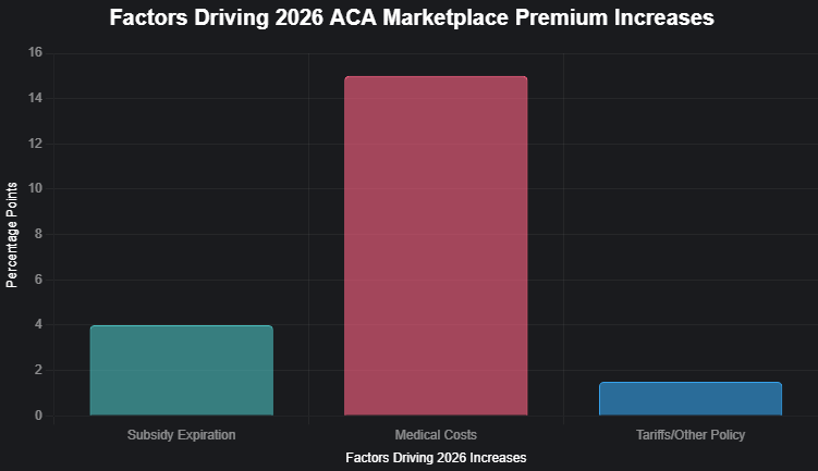 Policy & External Pressures: 0-3 points from tariffs inflating drug/supply chains, plus Trump-era tweaks like the Marketplace Integrity rule upping income shares by 2.7%.