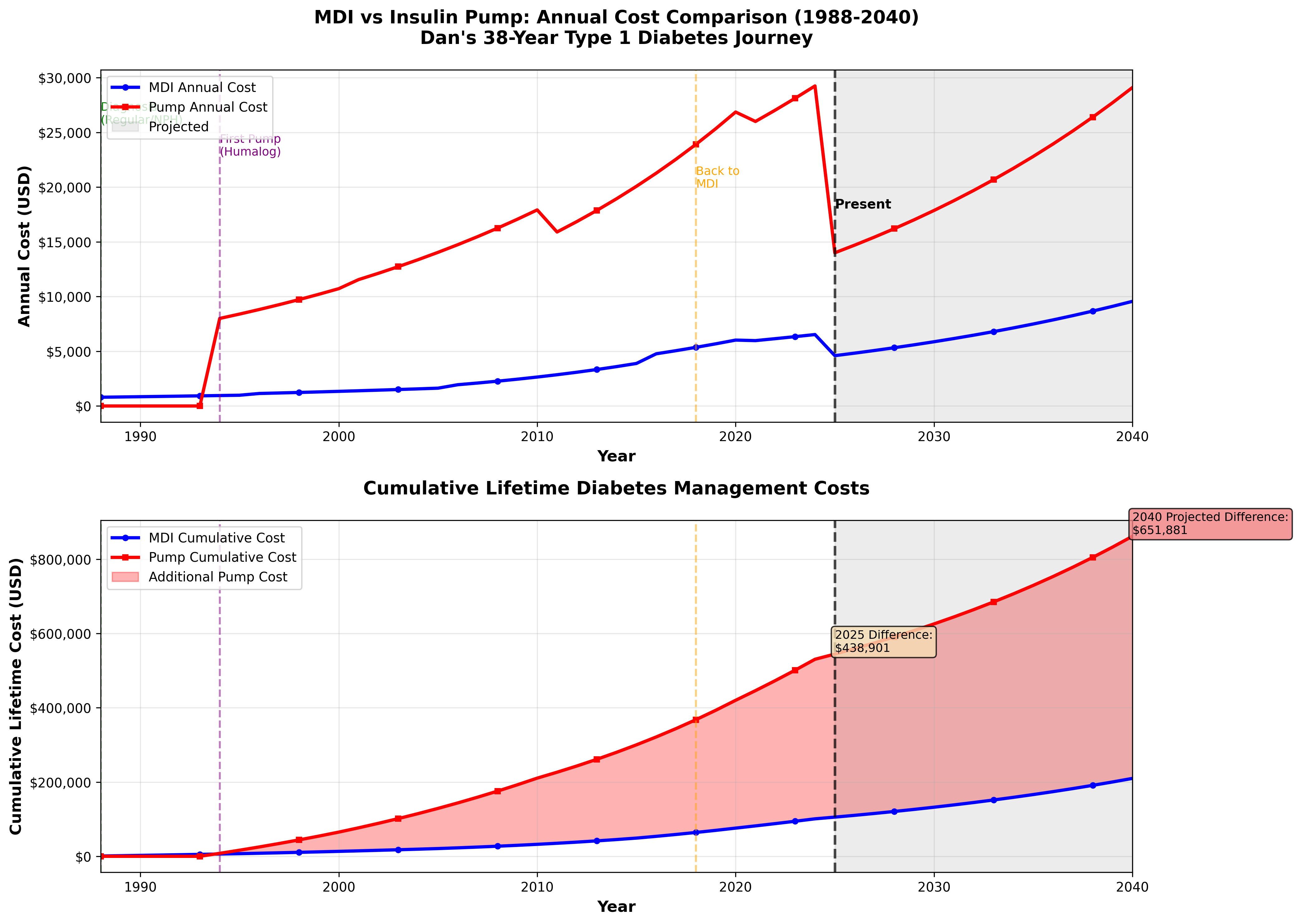 I created a graph tracking my actual diabetes expenses from 1988 to today, with projections through 2040 based on standard healthcare inflation of 5% annually. The numbers are sobering.