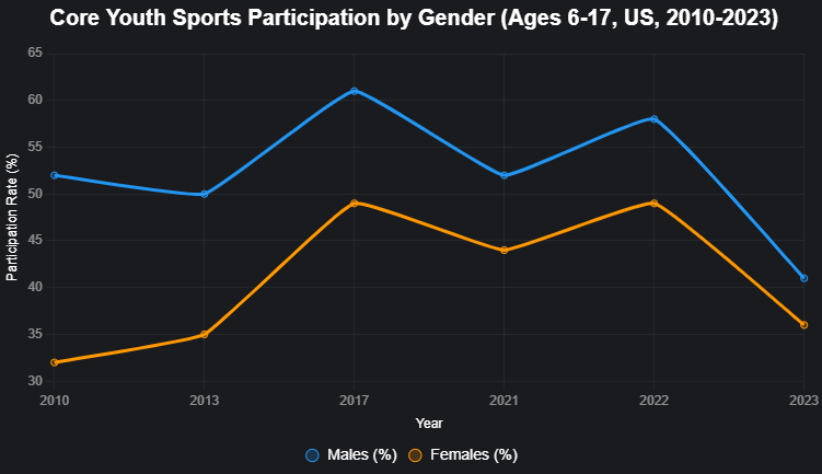 To visualize this, consider the chart below, which tracks core participation rates (regular team sports play) for youth ages 6-17 from 2019 to 2023, based on data from the Sports & Fitness Industry Association (SFIA) and Aspen Institute surveys. It shows a steady erosion, with rates dipping below 40% by 2023—the lowest in over a decade for many demographics.
