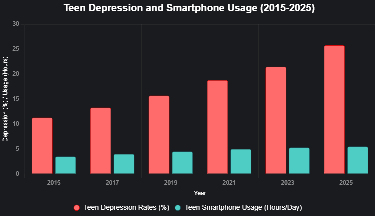 Smartphones aren’t just gadgets; they’re a cultural shift. A 2024 Pew Research Center study found 95% of U.S. teens aged 13-17 have smartphone access, with 45% saying they’re online “almost constantly.” Common Sense Media reports kids as young as 8 spend an average of 5.5 hours daily on screens, much of it social media. The fallout? A 2025 CDC report links excessive screen time to a 30% increase in teen depression and a 25% rise in self-harm since 2015.
